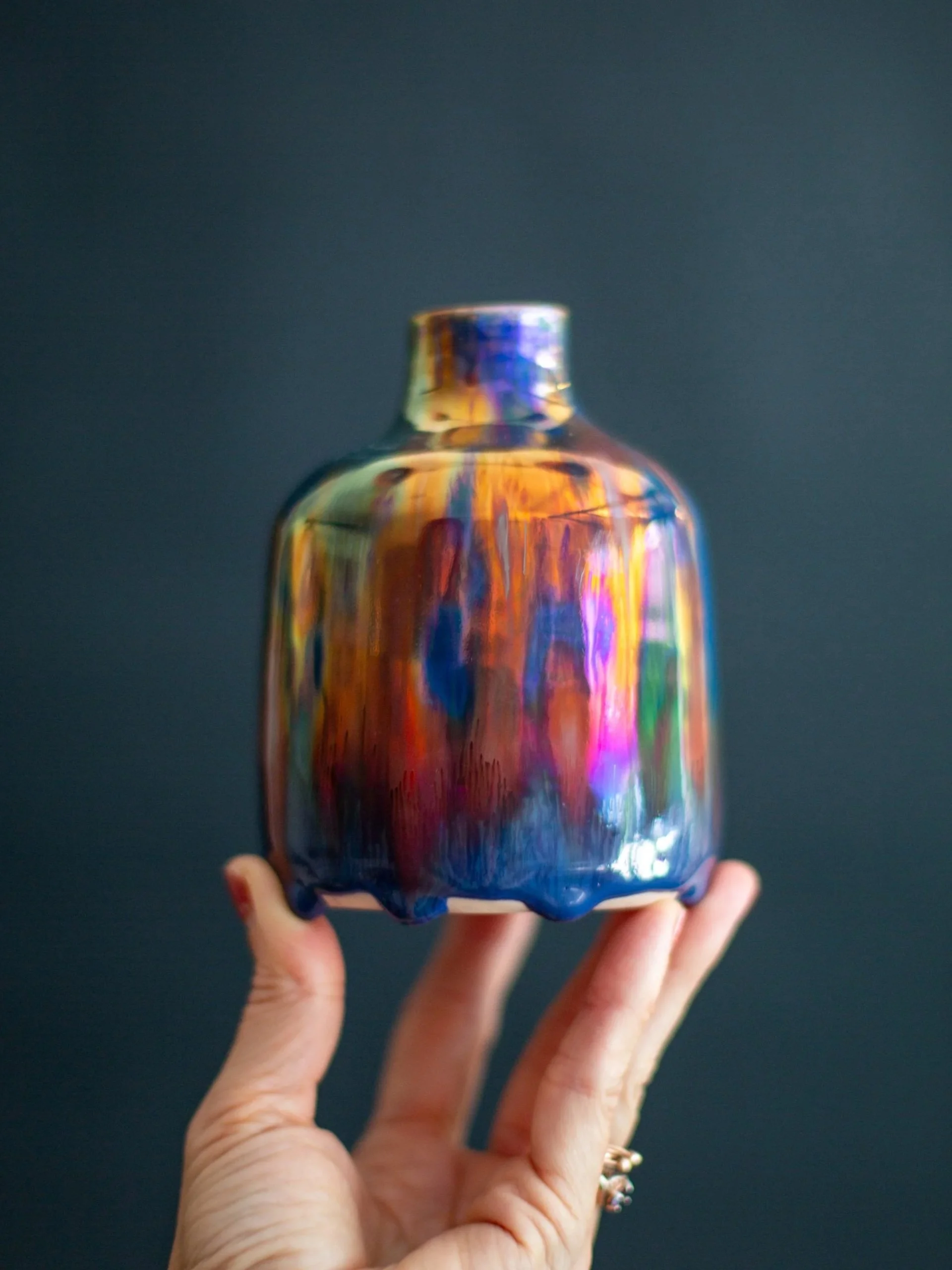 For a few years now, I’ve been obsessively working on perfecting and refining the chemistry of these in-glaze lusters at low and mid fire temperatures. I’ve also been gathering information through endless experimentation, to fine tune the complex reduction firing process it takes to achieve these results. It’s been years of playing, tweaking, testing, and very often - when constantly experimenting - the pieces don’t work out. But I’m always chasing that colorful shimmer, and the perfection of the process, and I would never think of giving up! The kiln openings are always magical. Even if only one piece survives the firing, I learn something from each load, and it’s always enough to keep me obsessing over creating more of these gorgeous finishes.